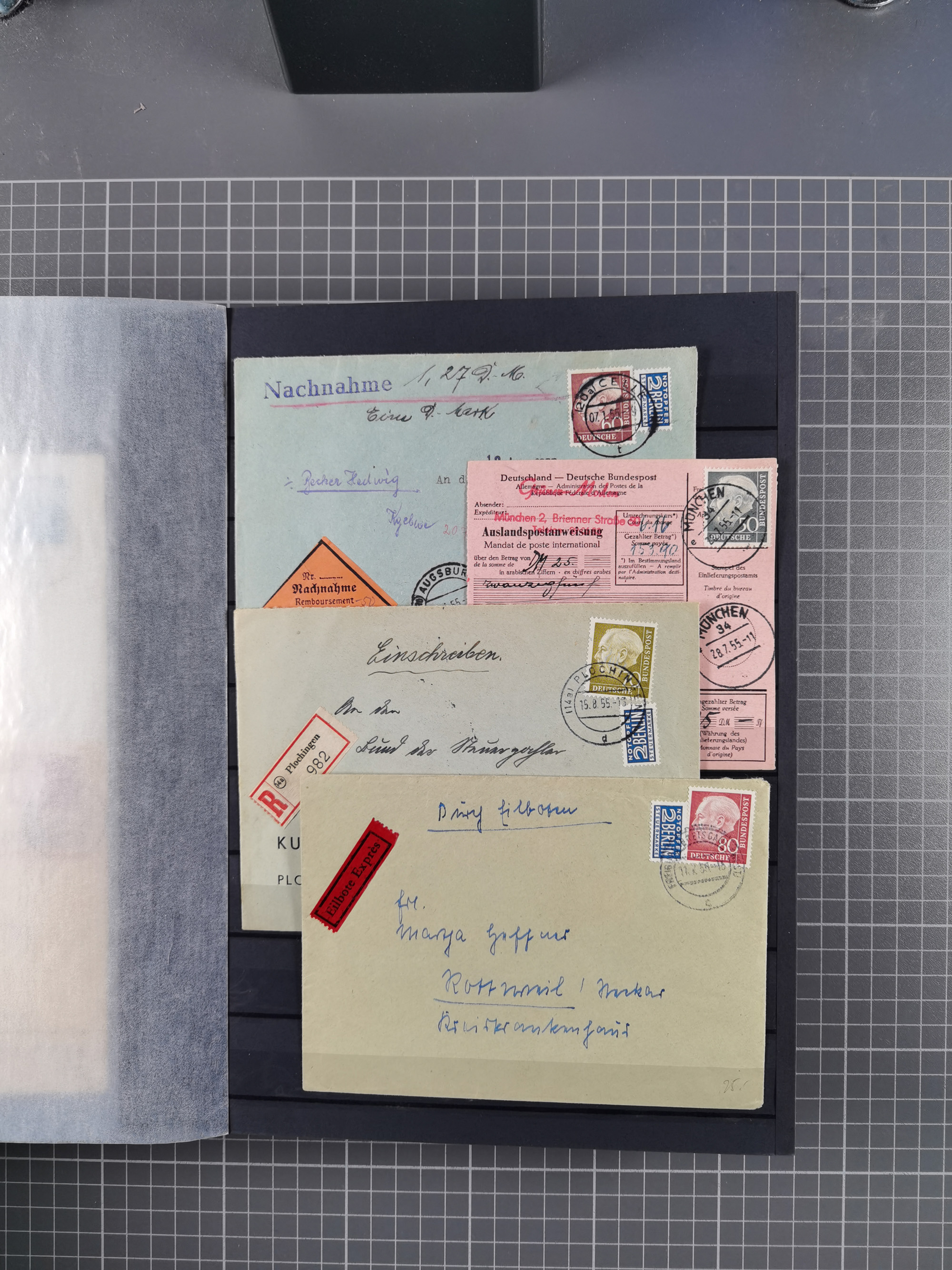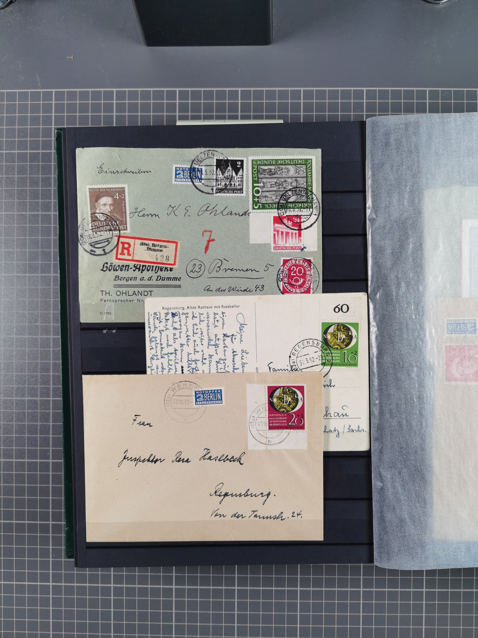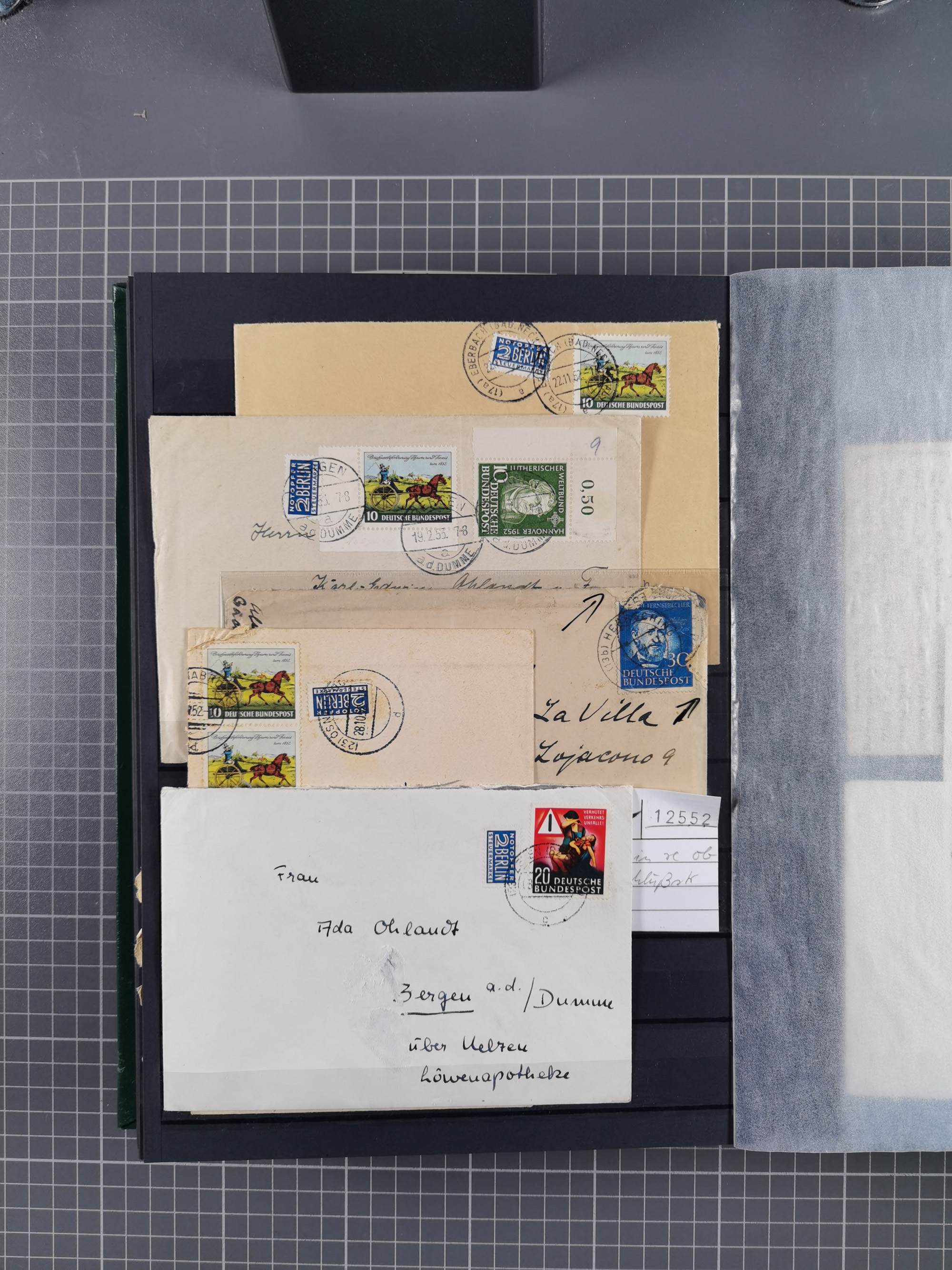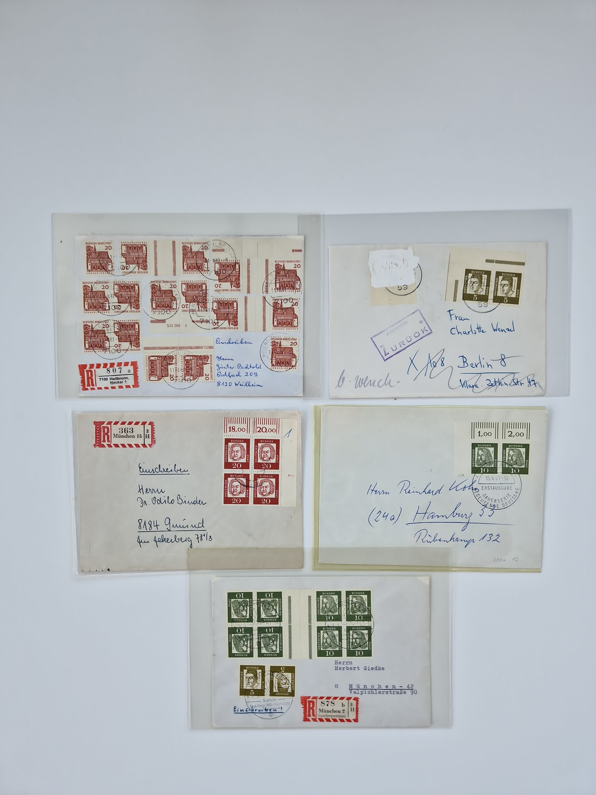 1949/2001, umfangreiche Sammlung mit geschätzt 5000 Briefen und Karten mit vielen besseren Einzel- und Mehrfachfrankaturen, R-Briefen, Portostufen, Luftpost, Auslandspost, Einheiten und besseren FDC. Dabei u.a. Mi.-Nr. 111-12FDC, 115 MEF auf R-Brief, 116 MEF auf R-Brief, Mi.-Nr. 121-22 je im Paar auf R-Brief “Bonn-Bundeshaus”, 139 MEF, 146 (3) MEF auf R-Auslandsbrief, 159-59 FDC, 156 (5) MEF, 188 im waagerechten Paar auf LP-Brief mit Portomarken, Heftchenblatt 8YI auf Eilbotenbrief, 225 MEF auf R-Brief, 260 im waagerechten Paar auf Eilbotenbrief und 263 im waagerechten Paar auf Erstflugbrief