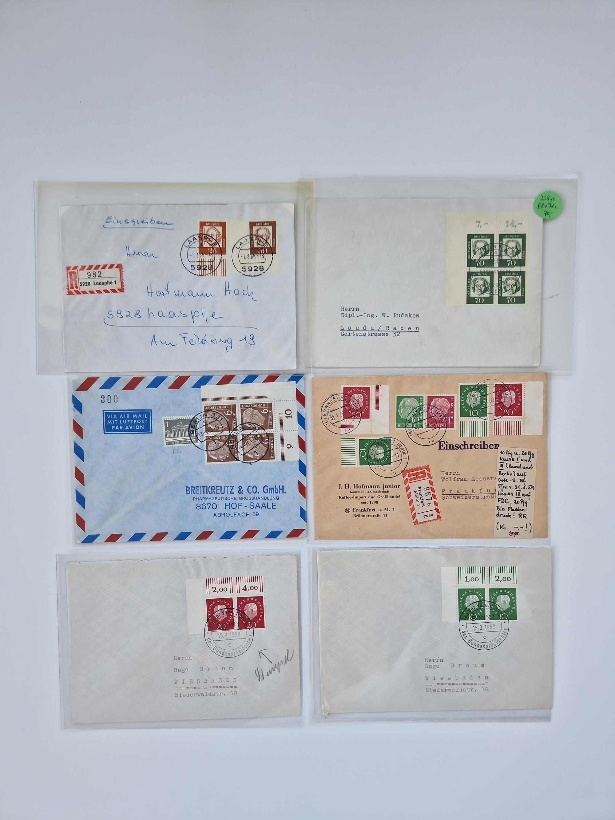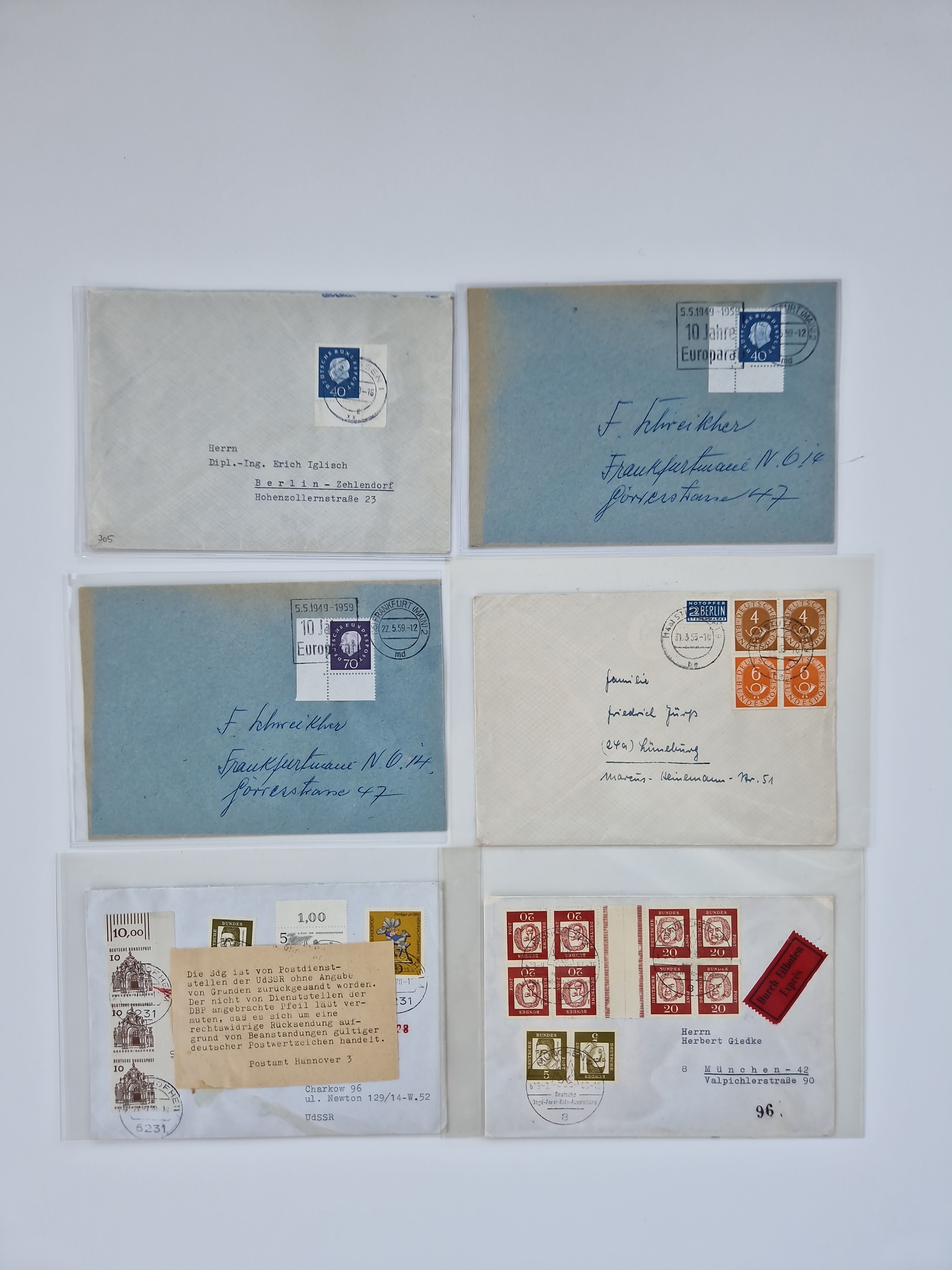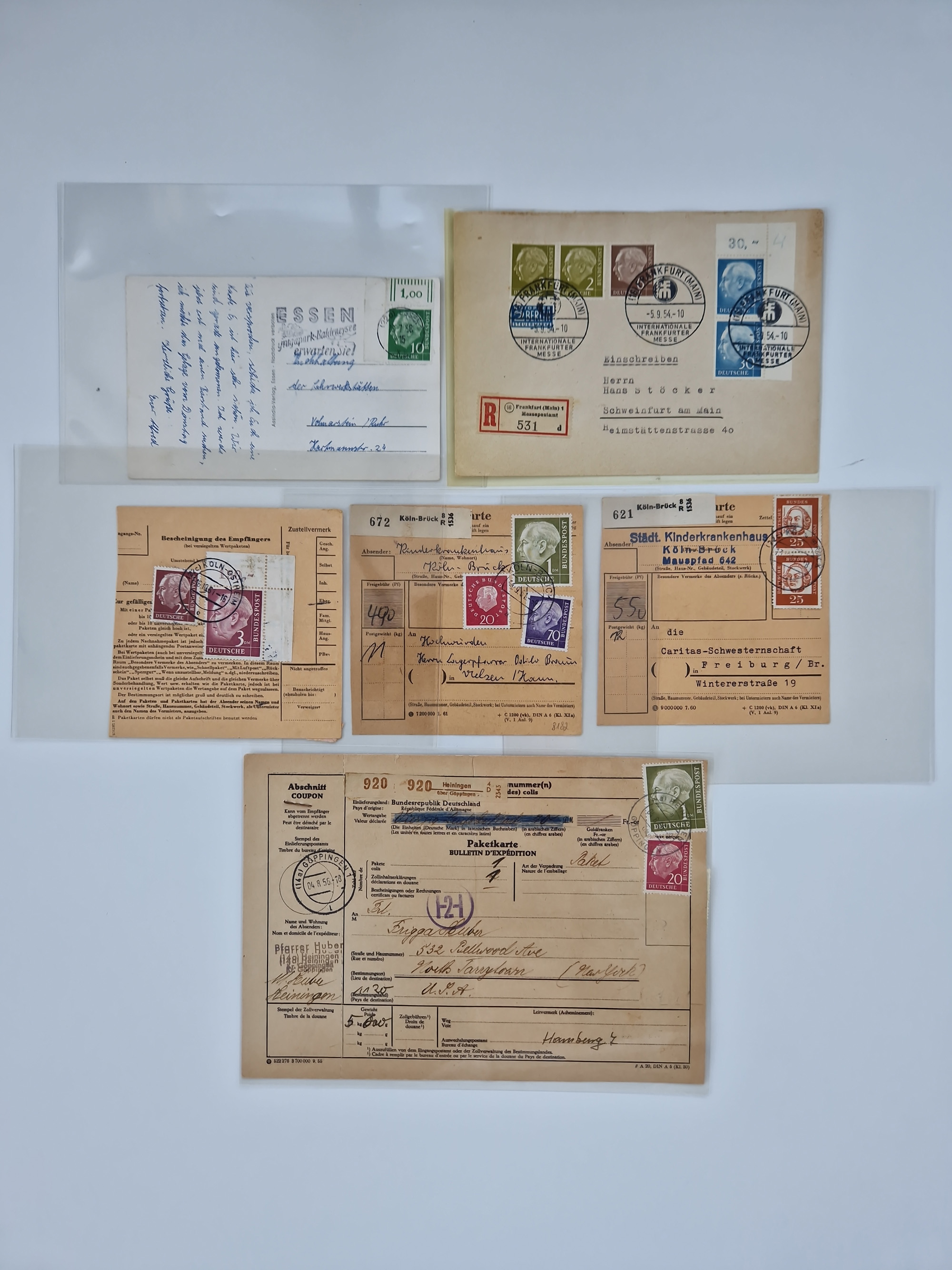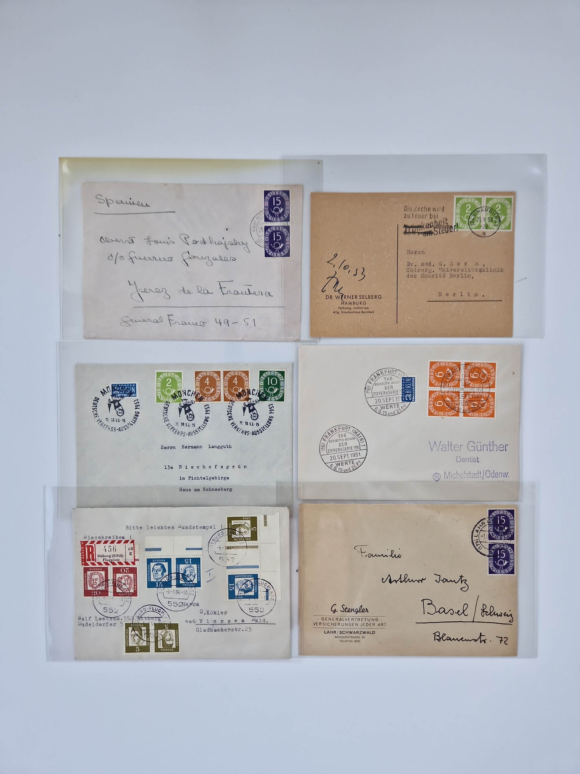1949/94, fast 40 Briefe und Karten mit Schwerpunkt bei den Posthorn- und Heuss-Frankaturen. Dabei interessante Luftpost-Frankaturen in die USA, R-Briefe und bessere Sondermarken-Frankaturen