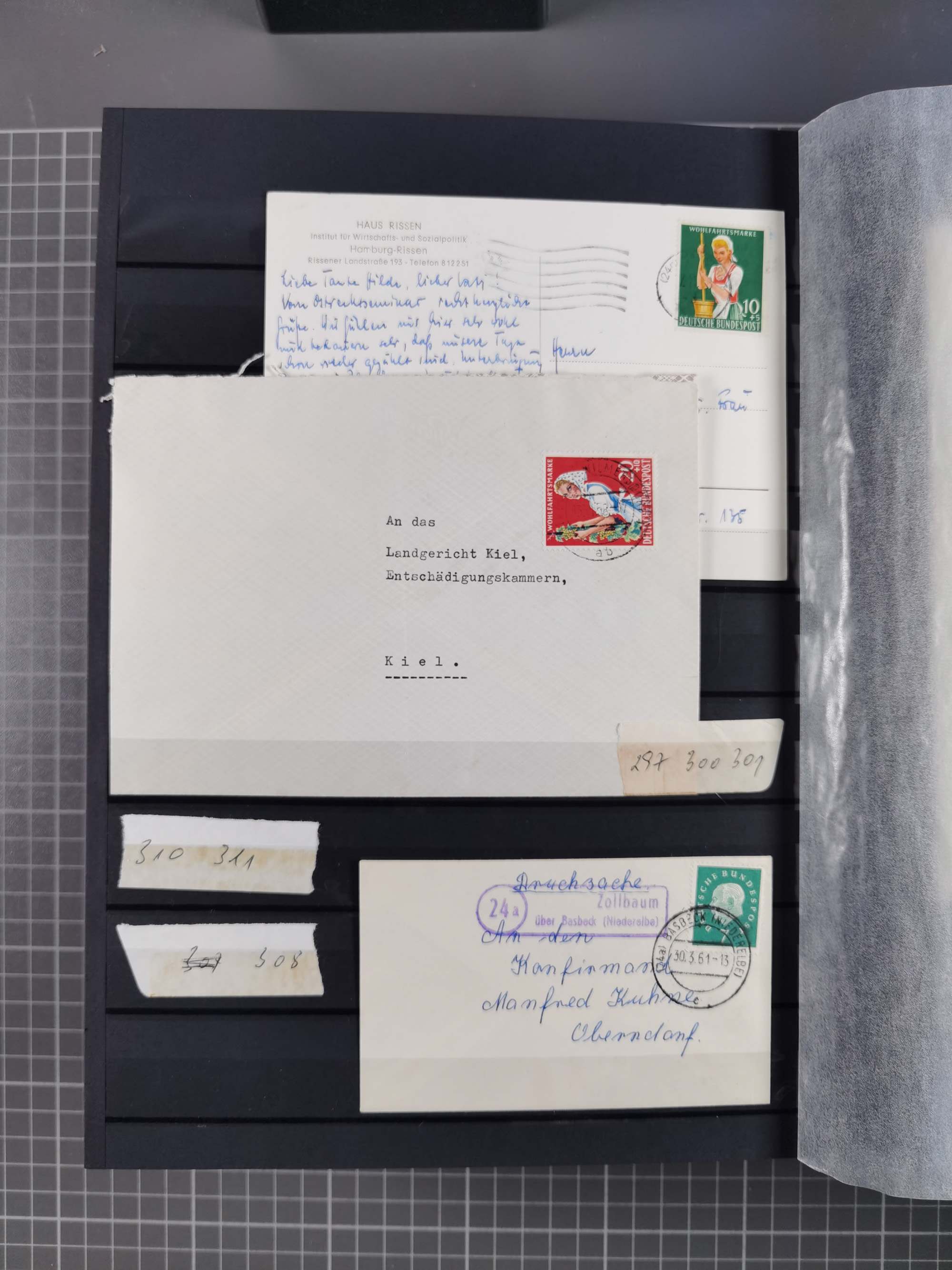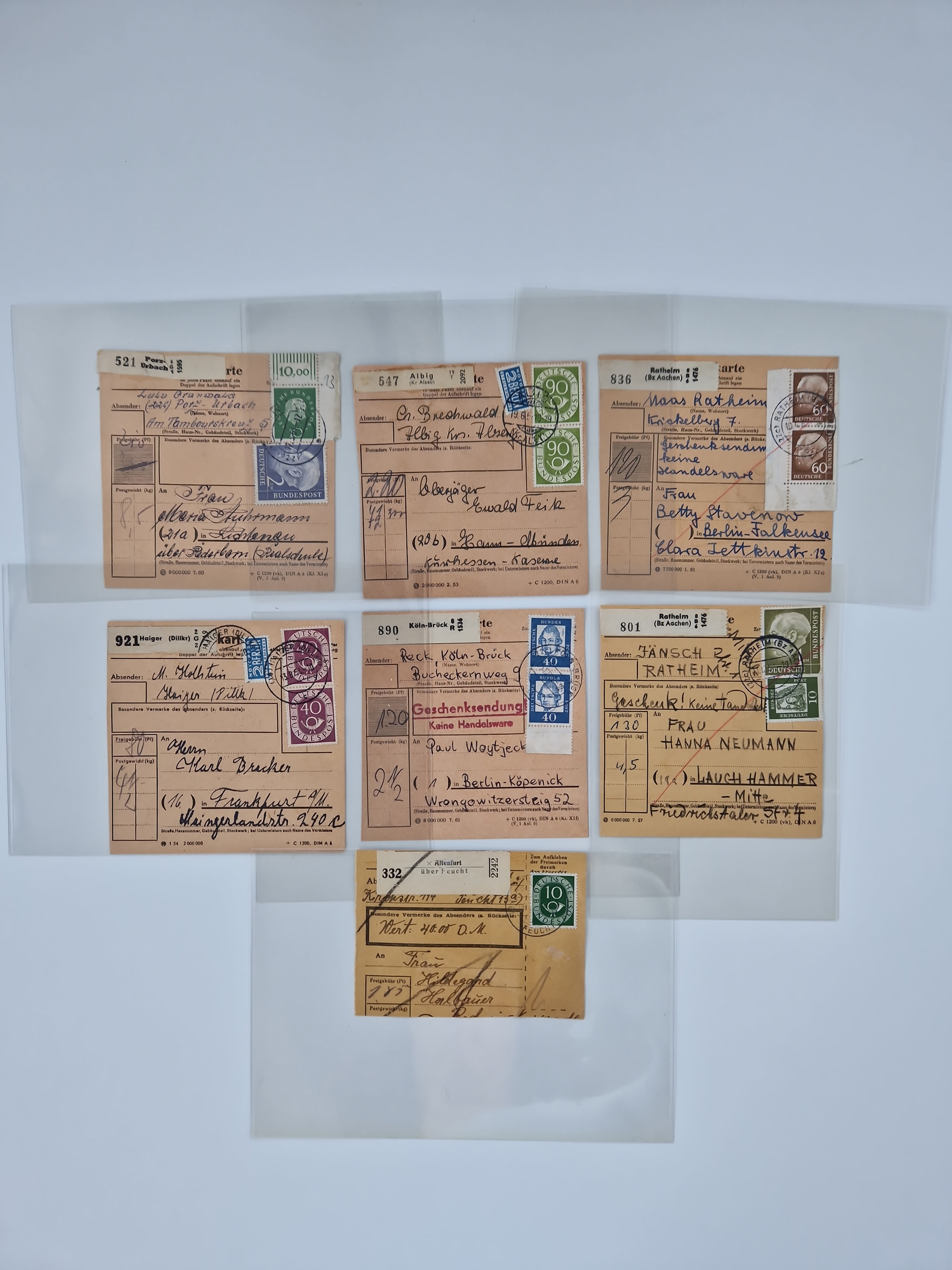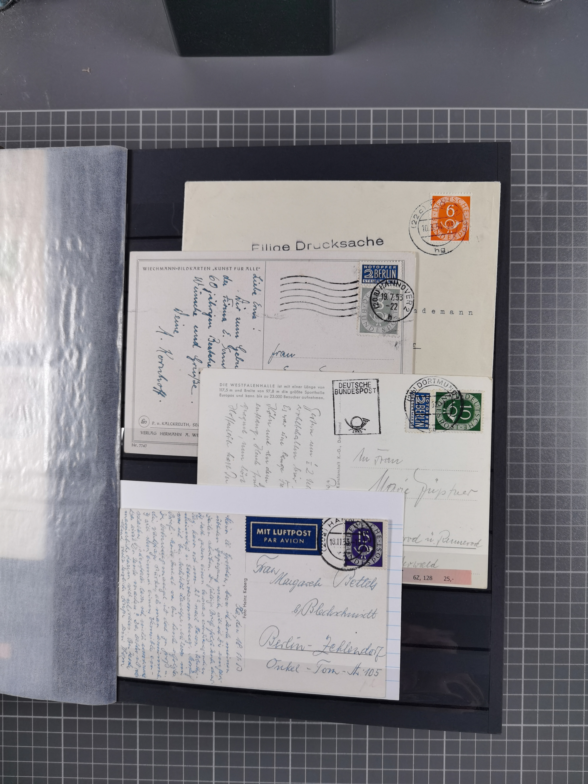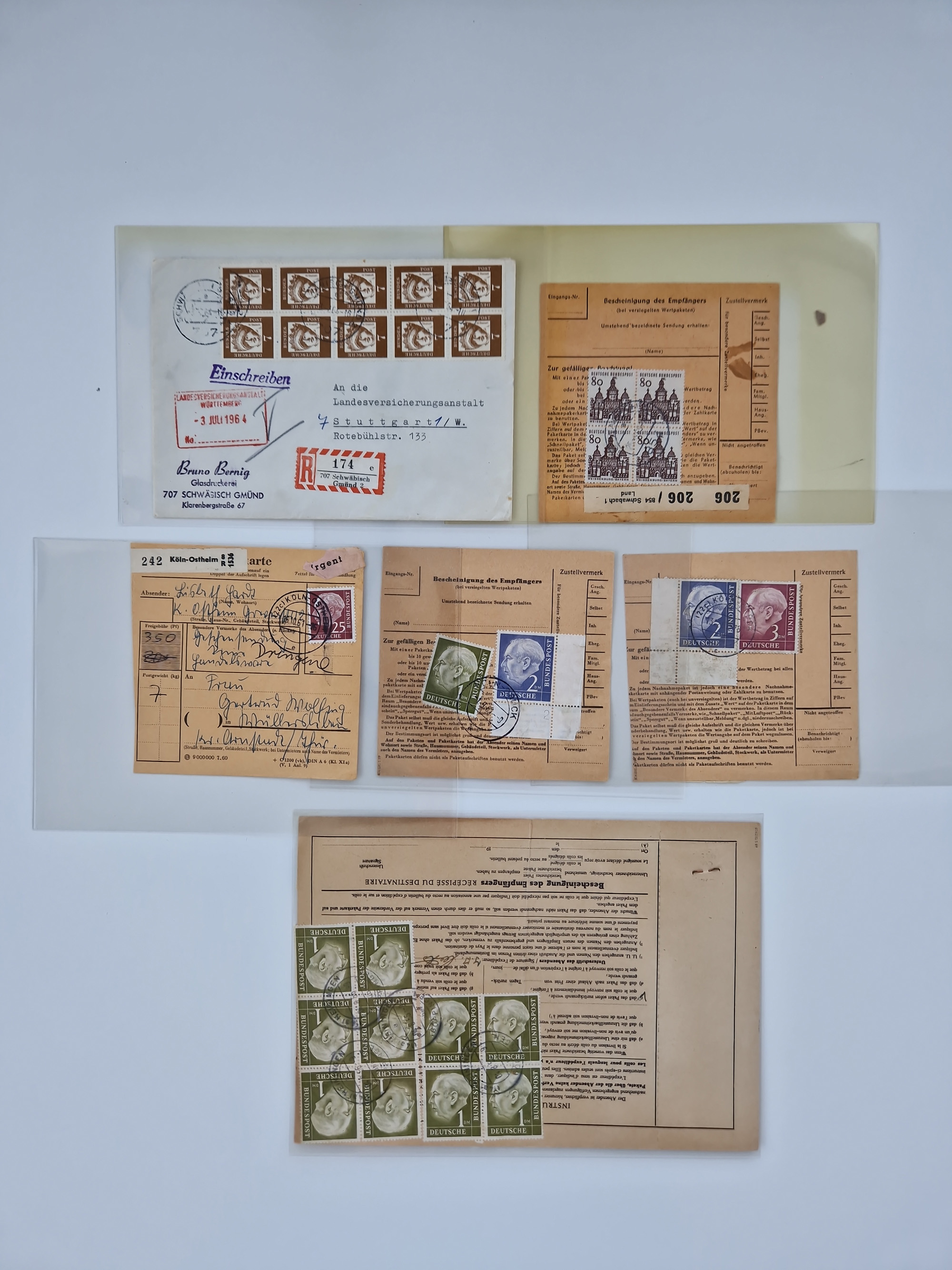 1962/64, Propaganda „Kalter Krieg", Sammlung von 277 Briefen, alle mit Propaganda-Vignetten versehen („Kampf um Wiedervereinigung". 17. Juni", „Die Mauer überwinden", Brücken bauen! Per Post oder Paket". „Wir lassen uns nicht trennen". 3 geteilt niemals!" usw. Alle Vignetten befinden sich auf Bedarfsbriefen und sind postalisch zusammen mit der Normalfrankatur abgestempelt, dabei auch 43 Luftpostbriefe, selten angeboten. Dazu noch 48 Belege Postkrieg".