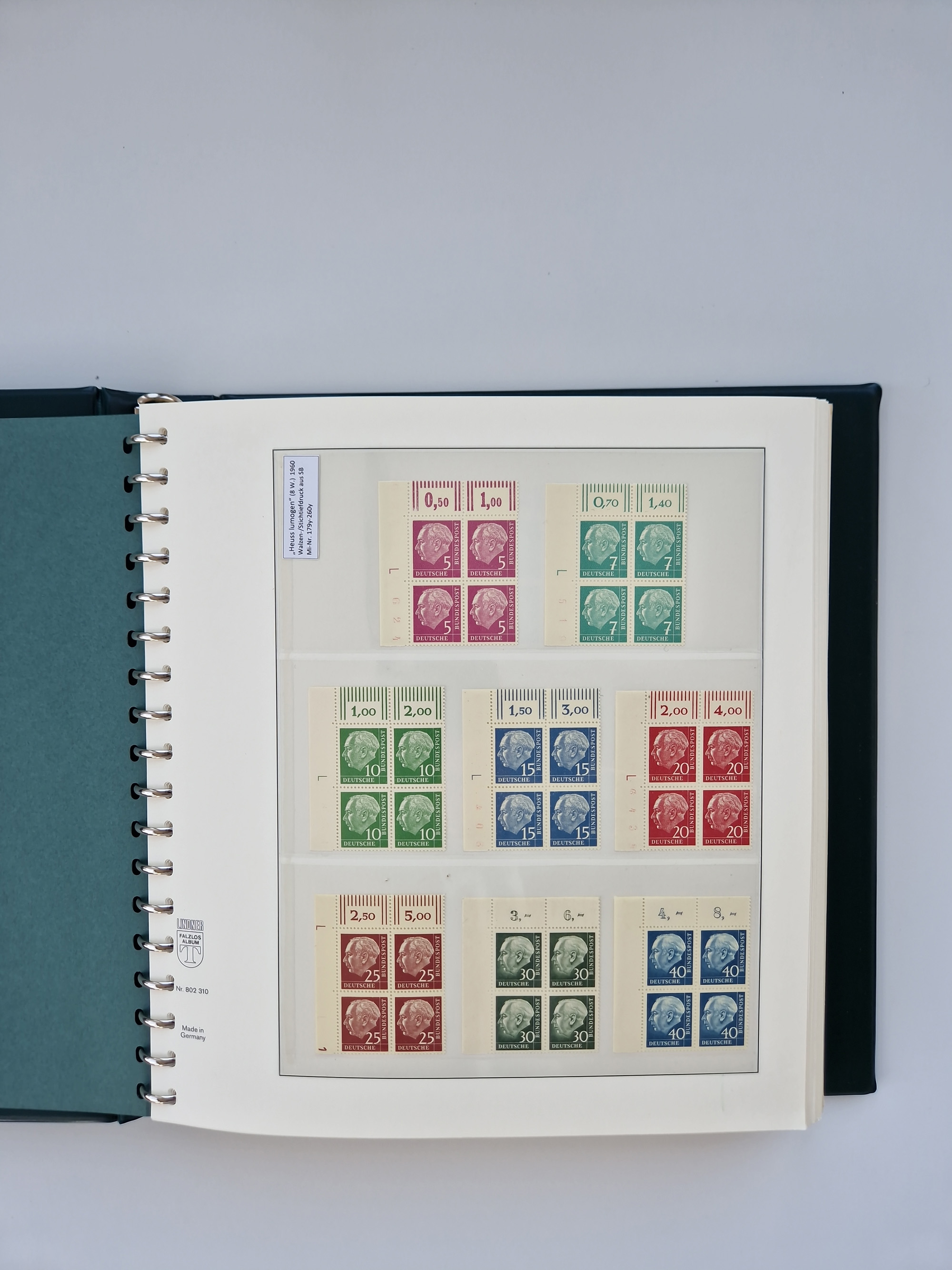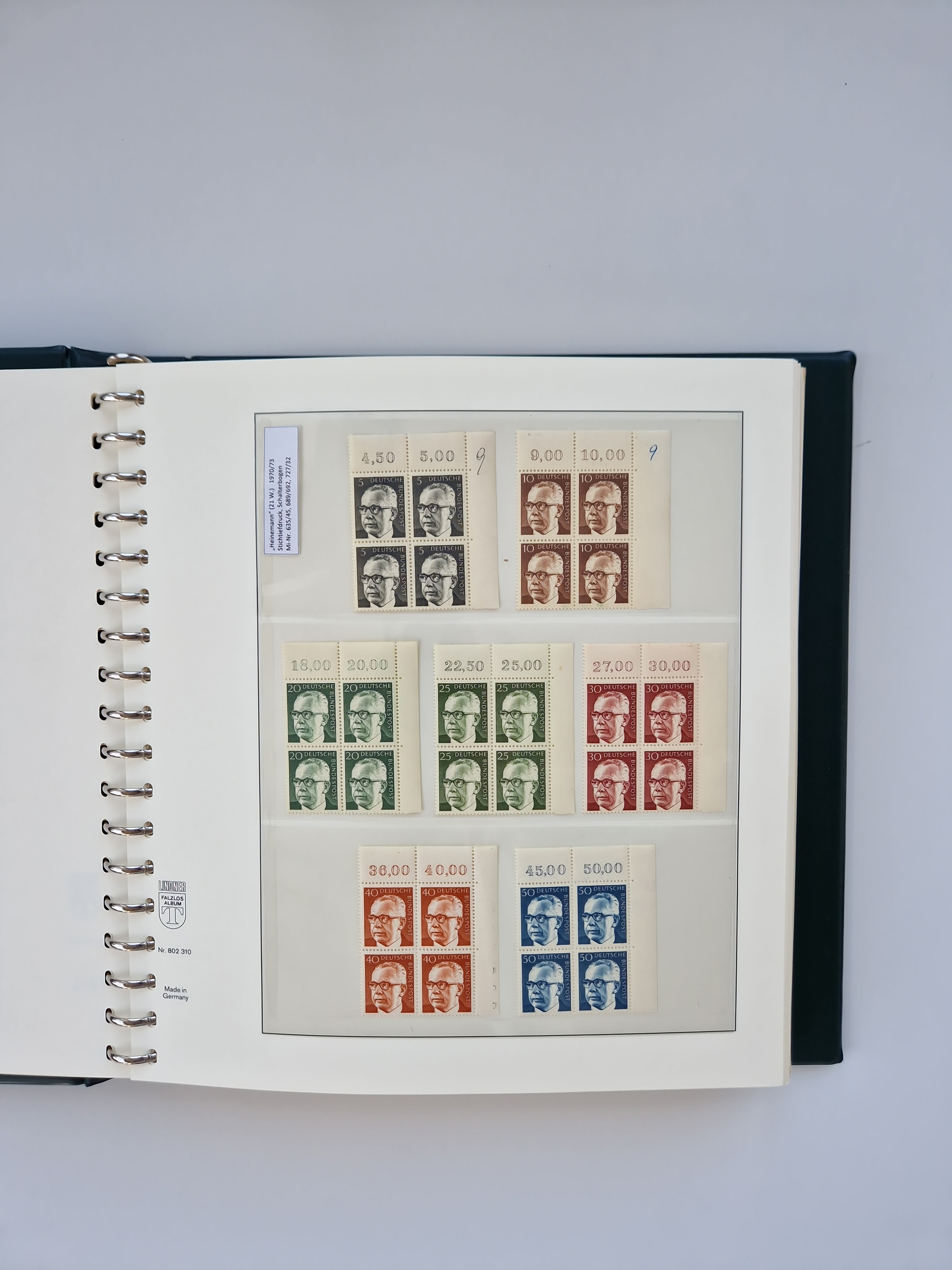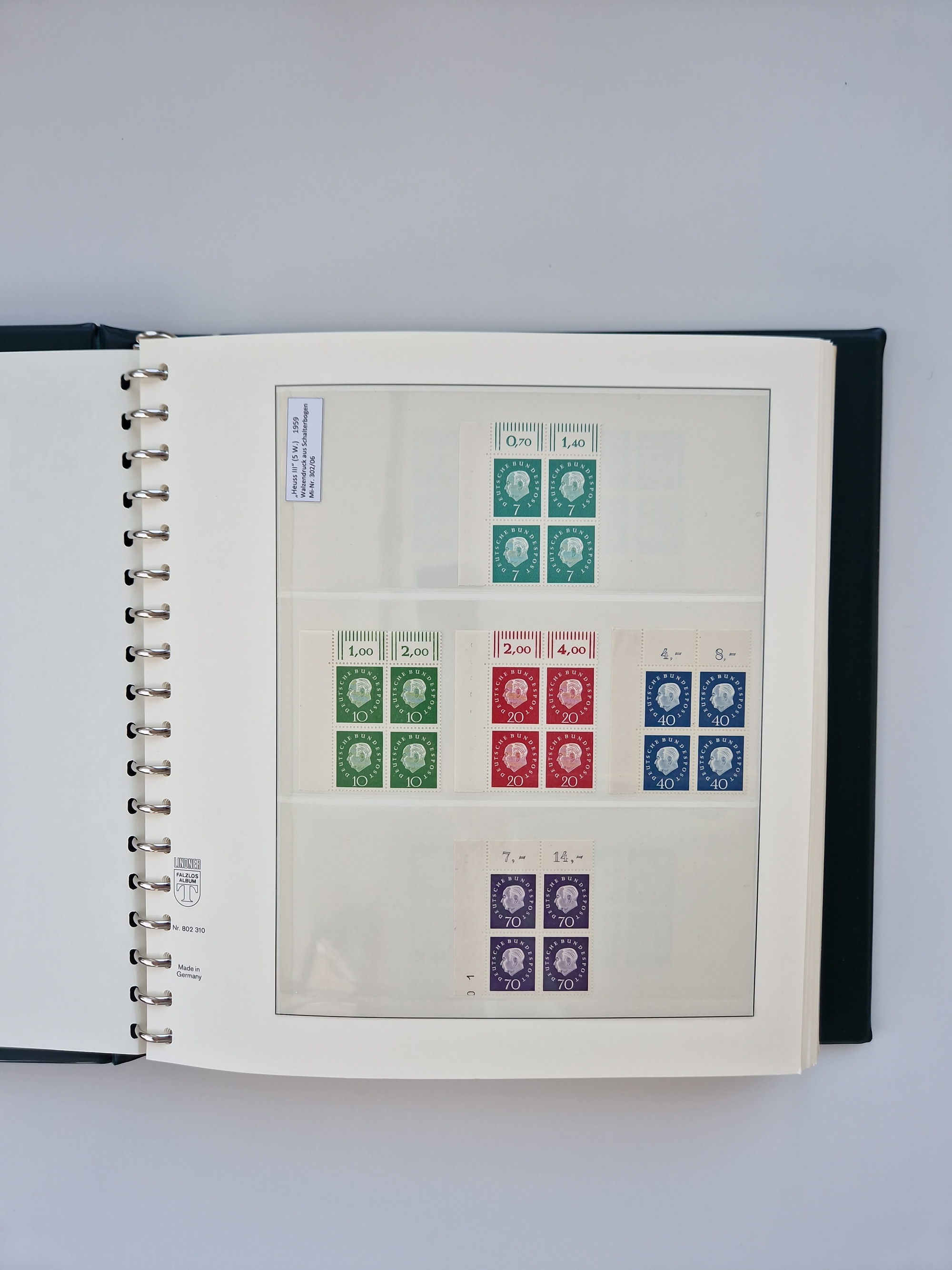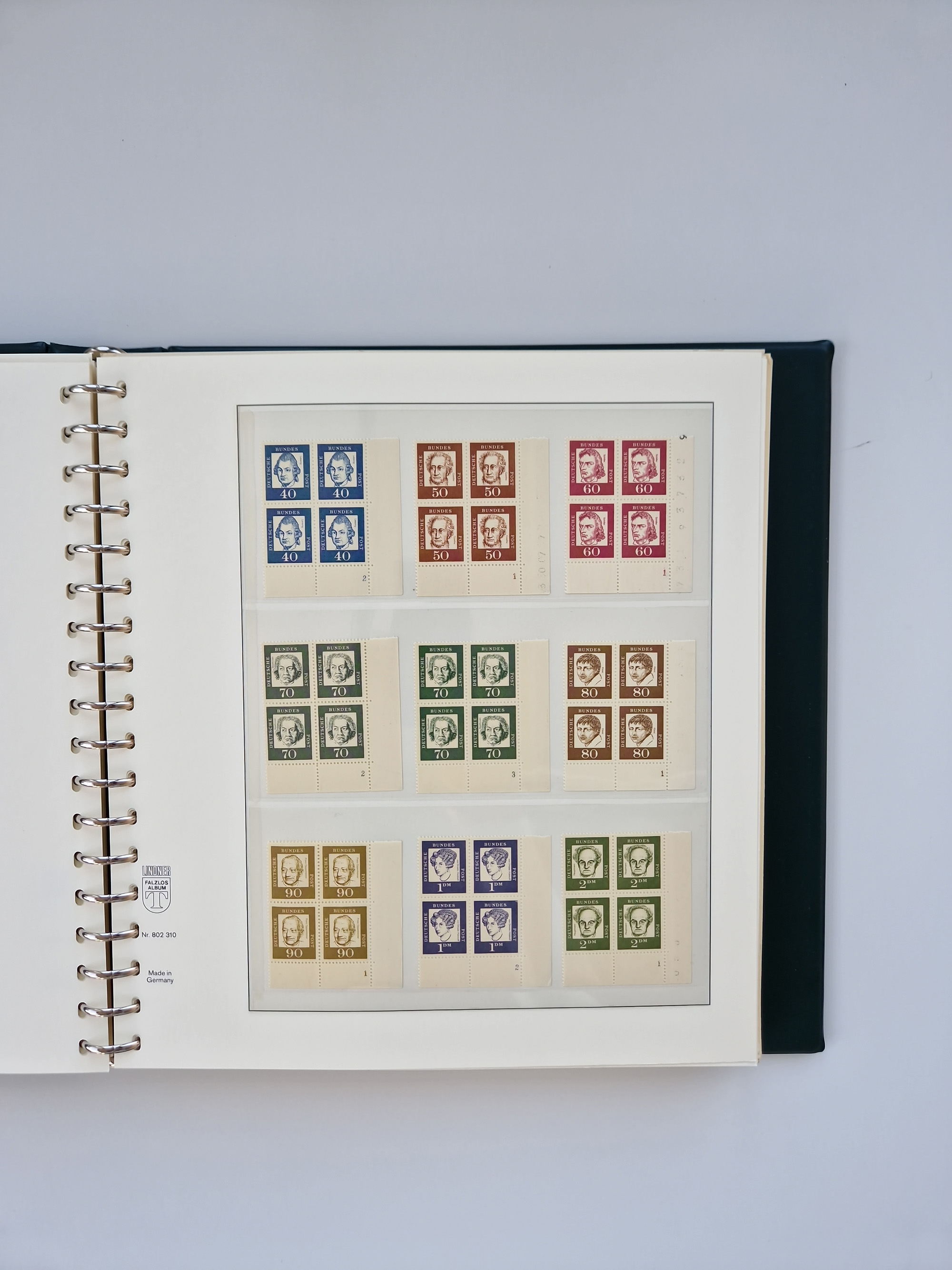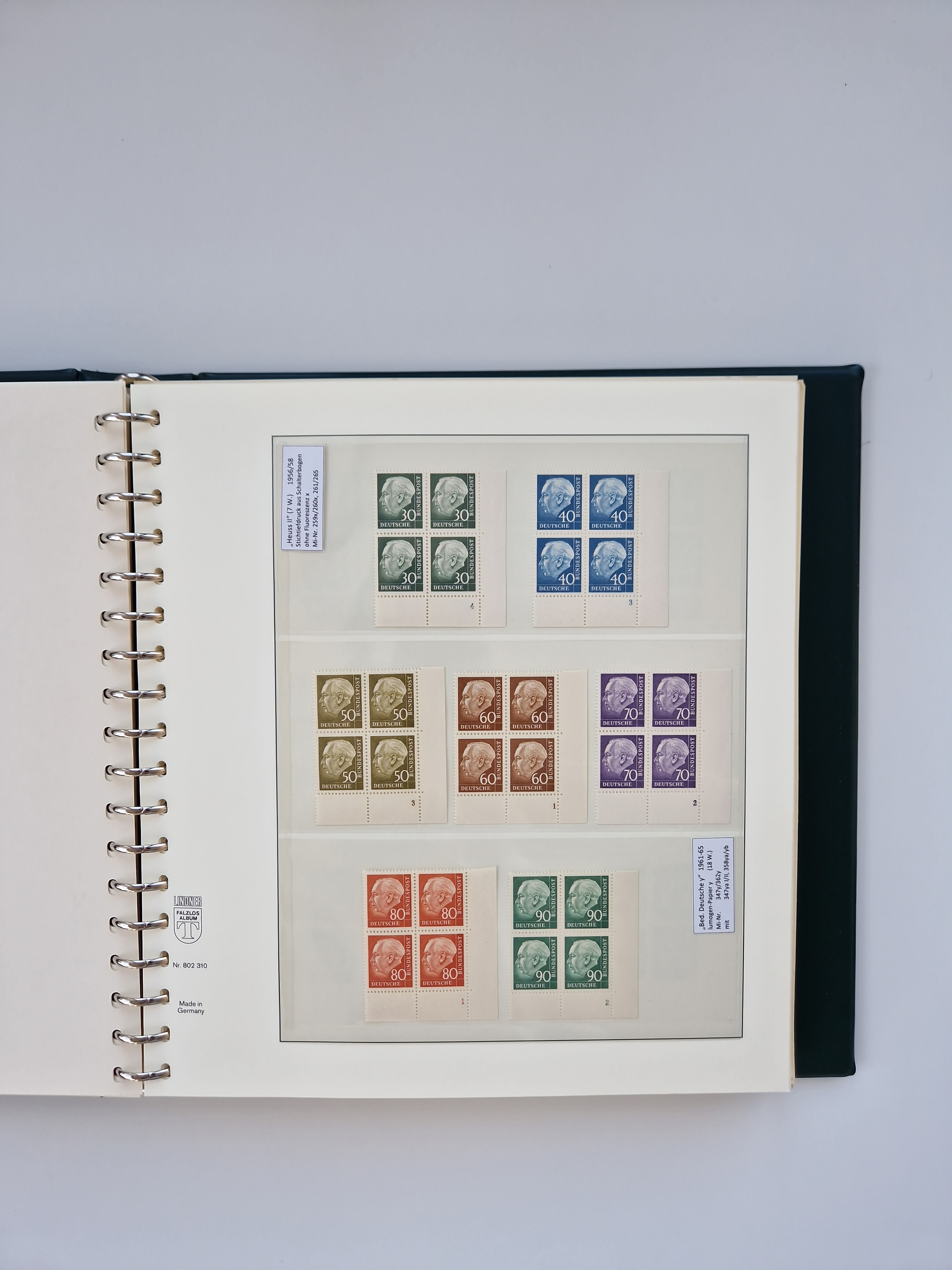 1951/94, postfrische Sammlung Dauerserien, dabei Posthorn in waagerechten oder senkrechten Paaren mit 3 Attesten und 6 Befunden A. Schlegel BPP, Heuss I Eckrandviererblocks, teils mit Druckerzeichen (Attest H.-D. Schlegel BPP). Heuss lumogen mit DZ Befund H.-D. Schlegel BPP. Heuss II Befund H-D Schlegel BPP. Danach Heuss III bis bedeutende Frauen 1994 alles Eckrandviererblocks oben links mit vielen Druckerzeichen und sonstigen Randbesonderheiten, im Lindner-Falzlosalbum.