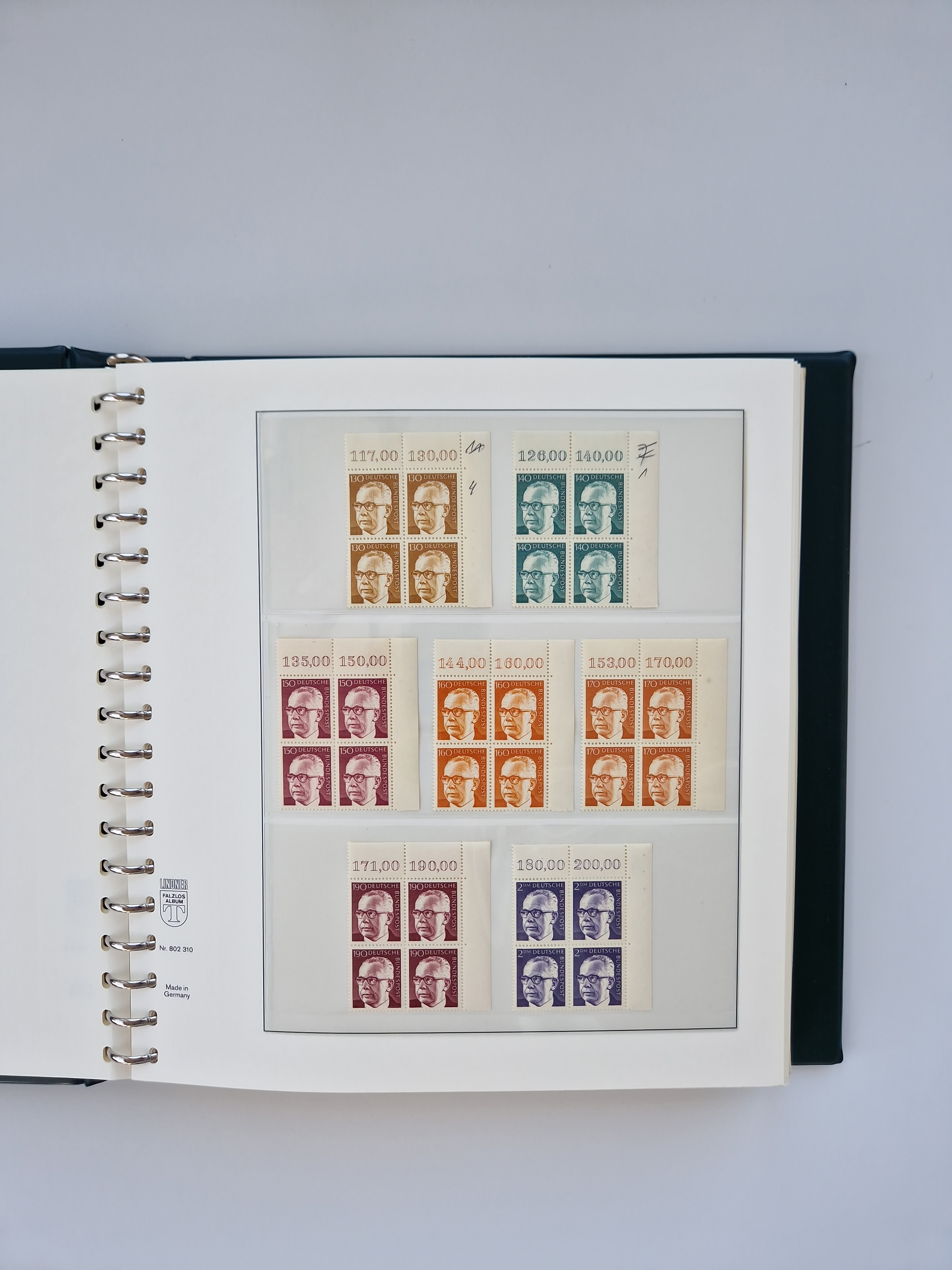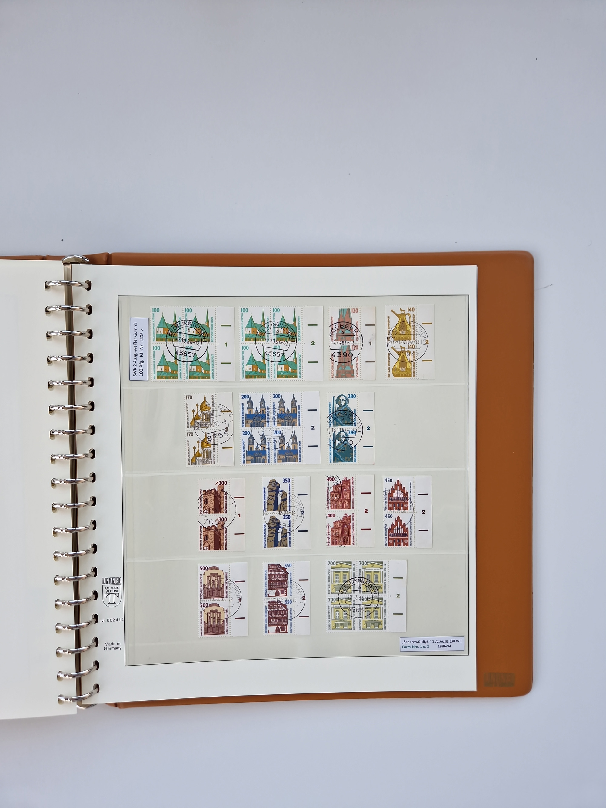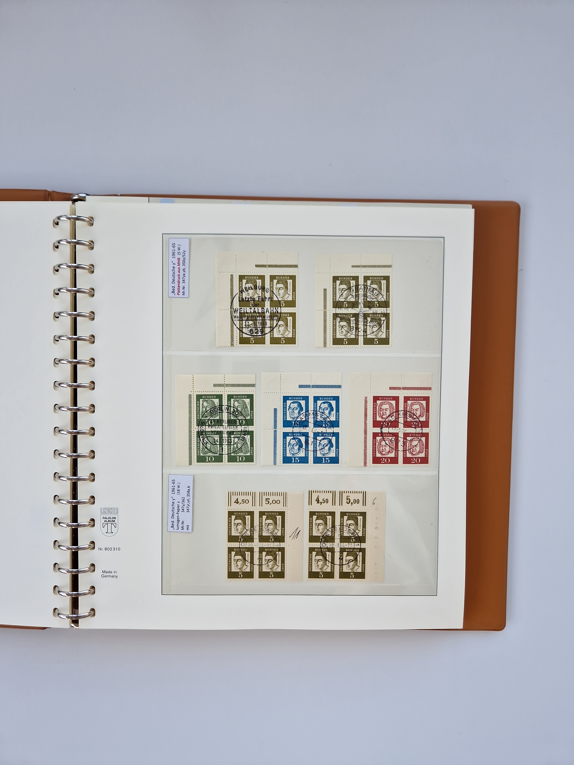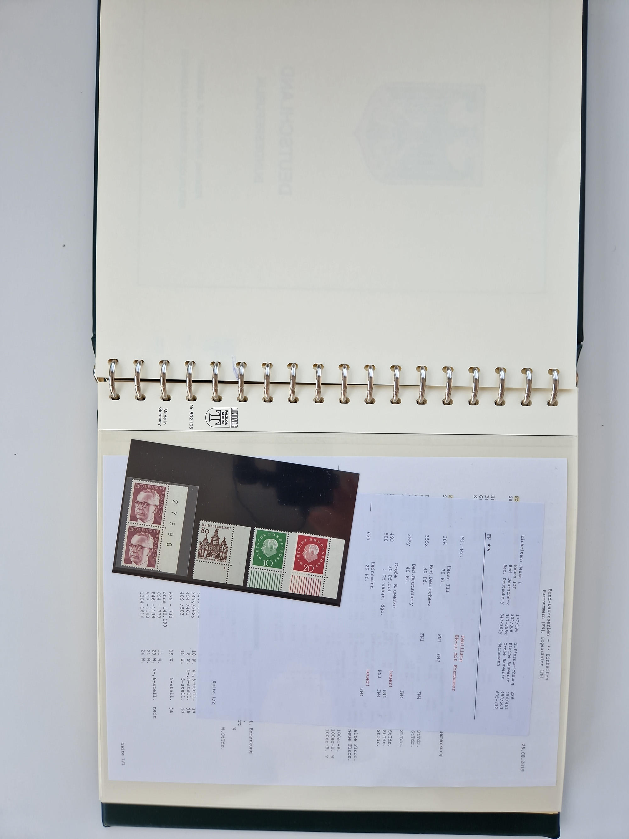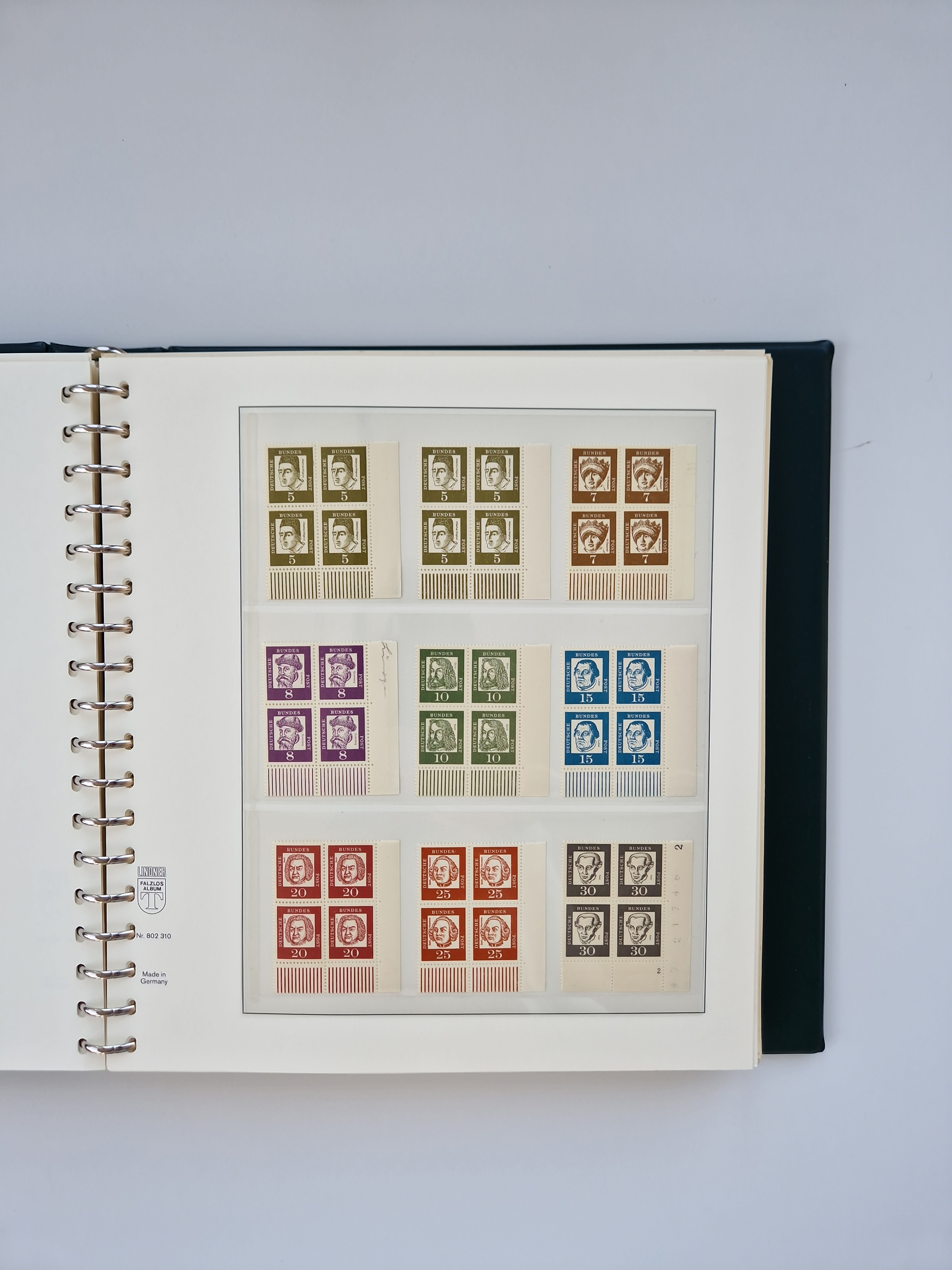 1951/94, postfrische Sammlung Dauerserien, dabei Posthorn in waagerechten oder senkrechten Paaren mit 3 Attesten und 6 Befunden A. Schlegel BPP, Heuss I Eckrandviererblocks, teils mit Druckerzeichen (Attest H.-D. Schlegel BPP). Heuss lumogen mit DZ Befund H.-D. Schlegel BPP. Heuss II Befund H-D Schlegel BPP. Danach Heuss III bis bedeutende Frauen 1994 alles Eckrandviererblocks oben links mit vielen Druckerzeichen und sonstigen Randbesonderheiten, im Lindner-Falzlosalbum.