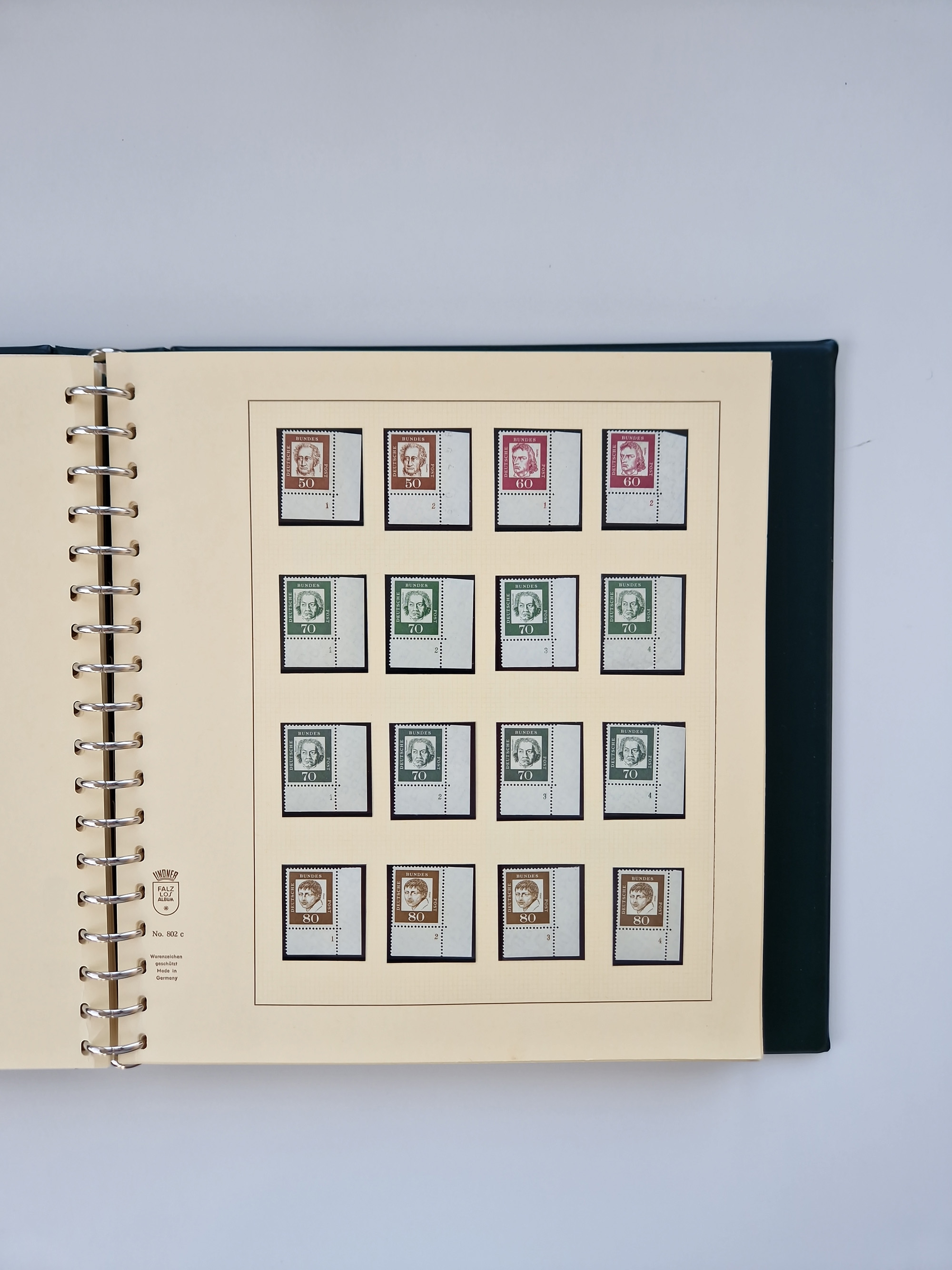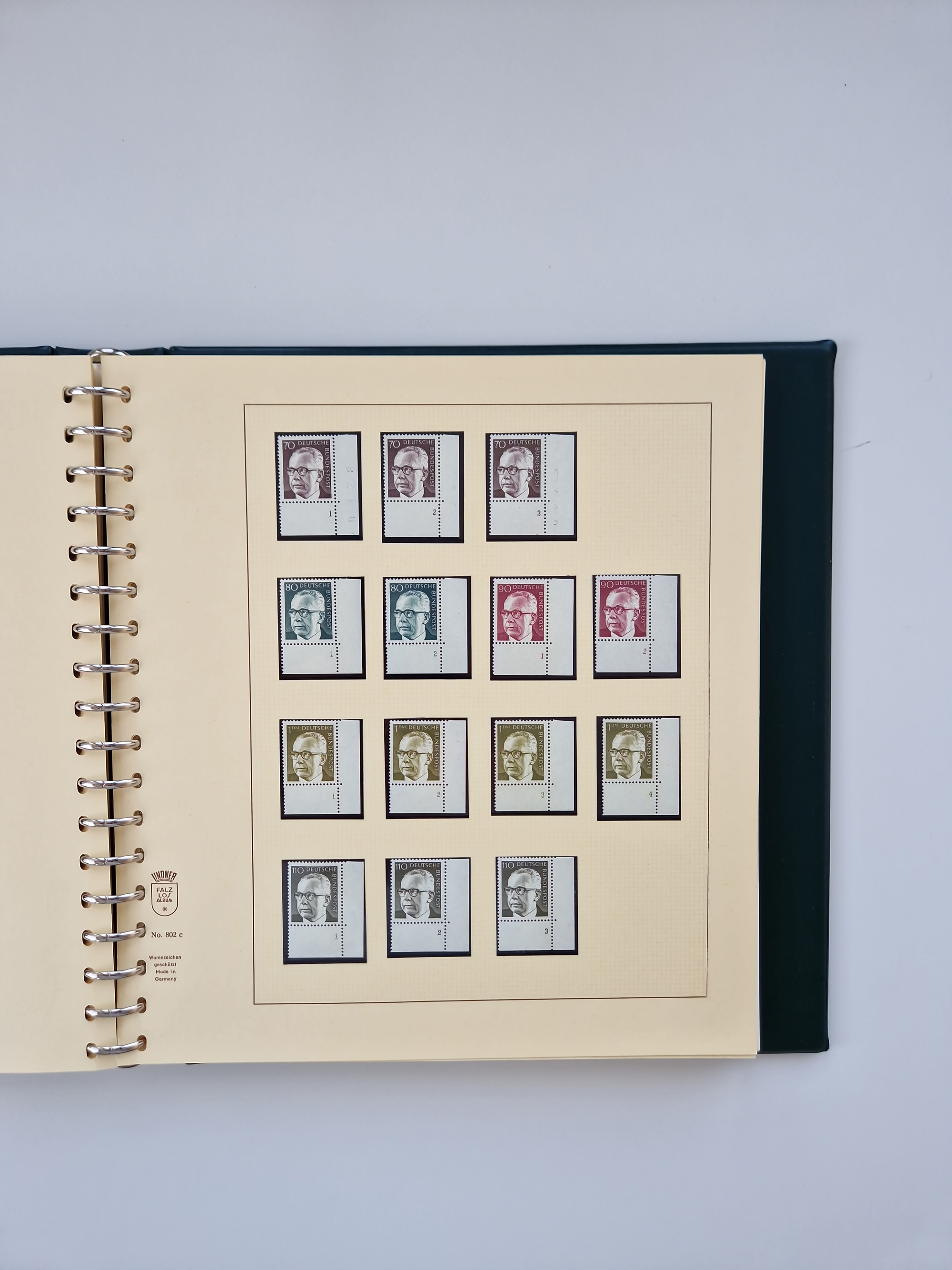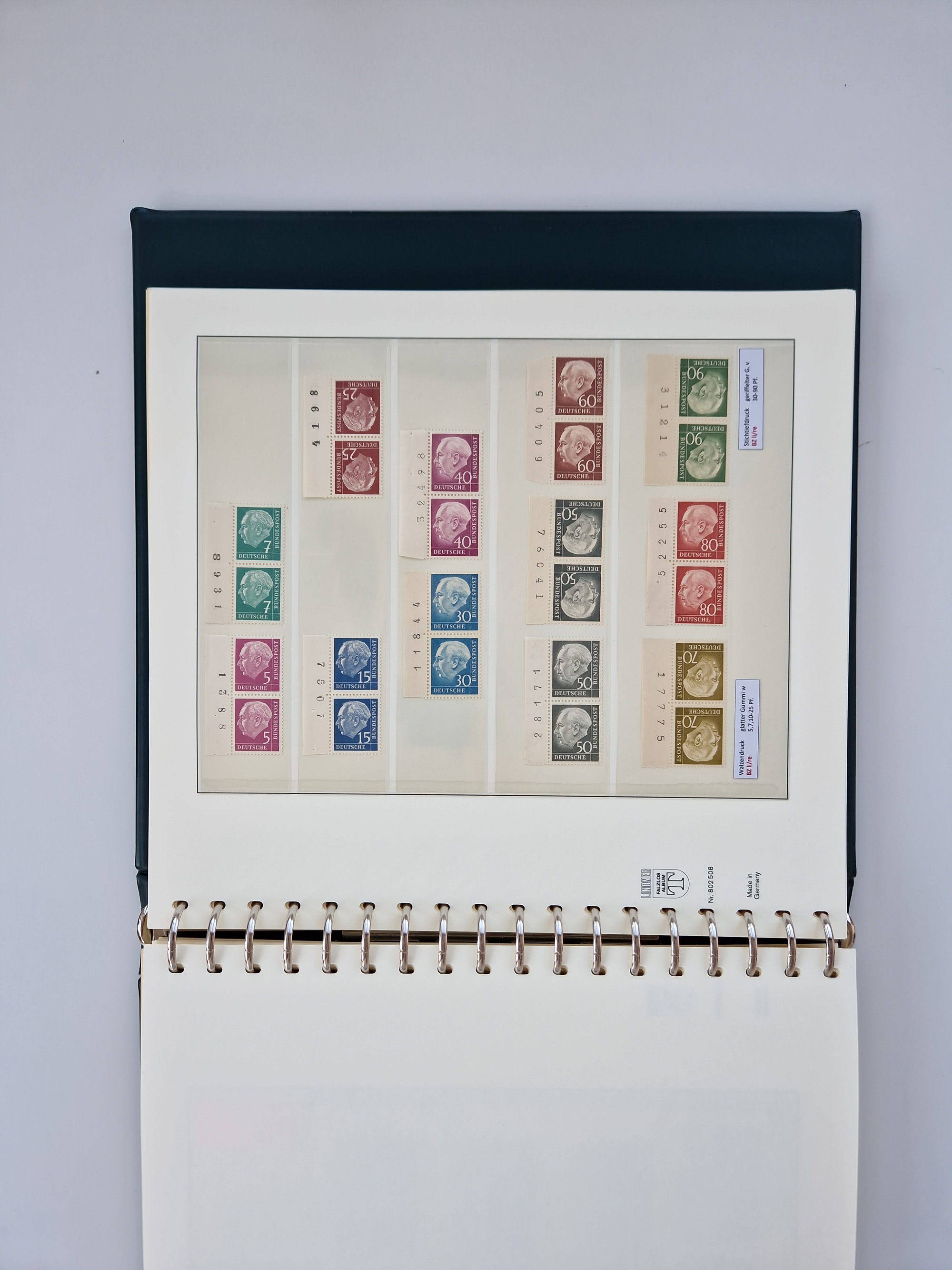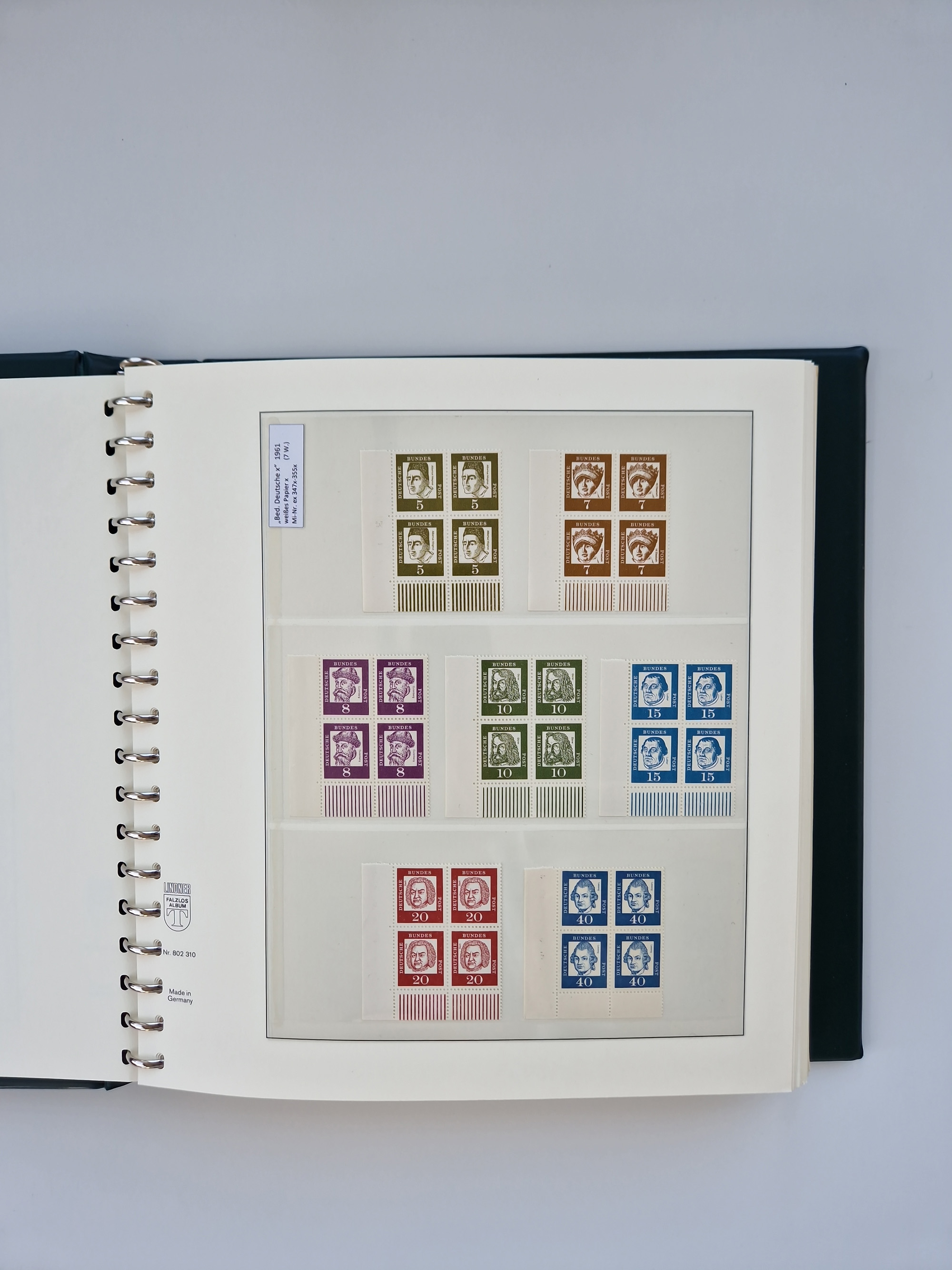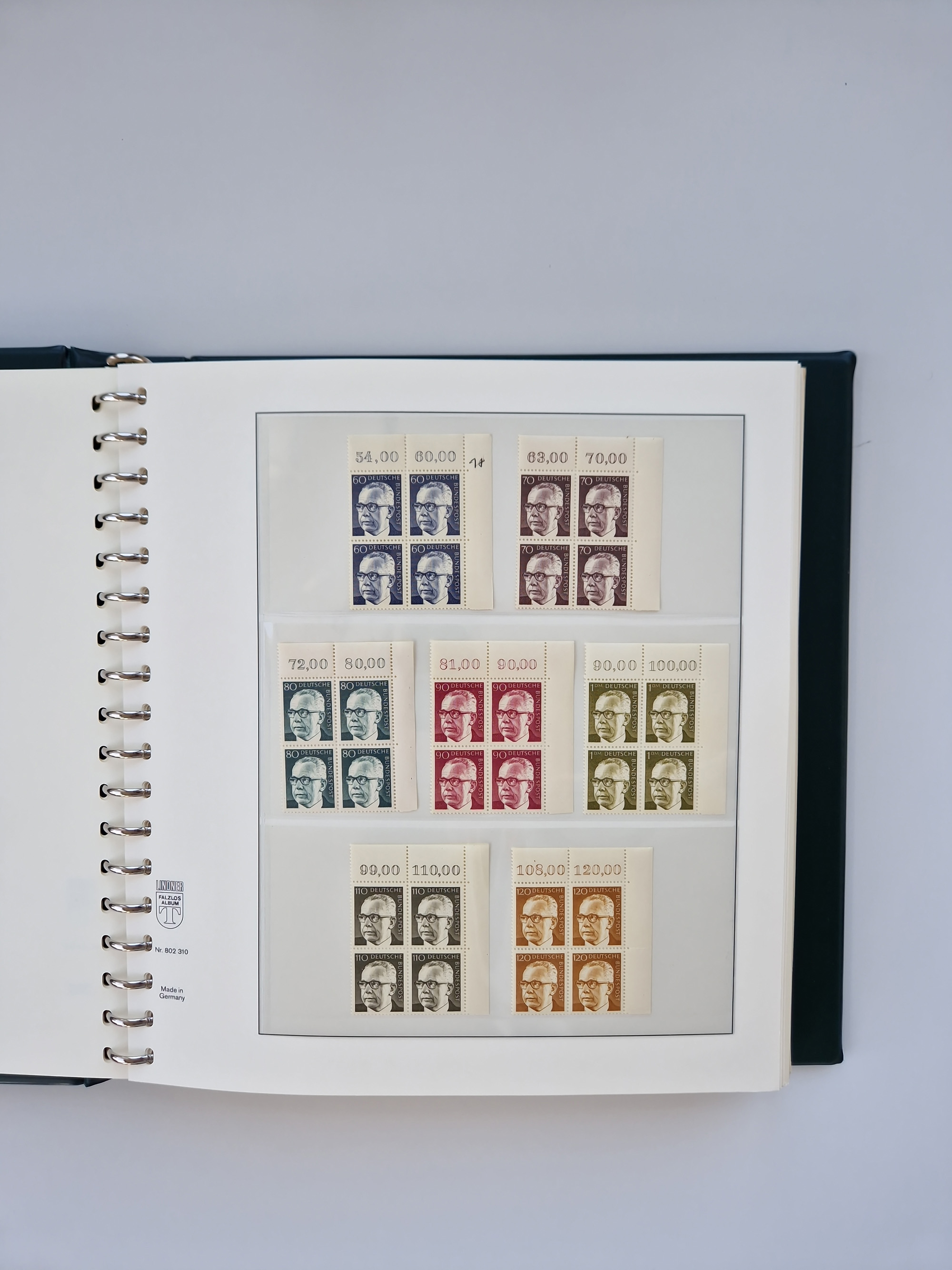 1951/94, postfrische Sammlung Dauerserien, dabei Posthorn in waagerechten oder senkrechten Paaren mit 3 Attesten und 6 Befunden A. Schlegel BPP, Heuss I Eckrandviererblocks, teils mit Druckerzeichen (Attest H.-D. Schlegel BPP). Heuss lumogen mit DZ Befund H.-D. Schlegel BPP. Heuss II Befund H-D Schlegel BPP. Danach Heuss III bis bedeutende Frauen 1994 alles Eckrandviererblocks oben links mit vielen Druckerzeichen und sonstigen Randbesonderheiten, im Lindner-Falzlosalbum.