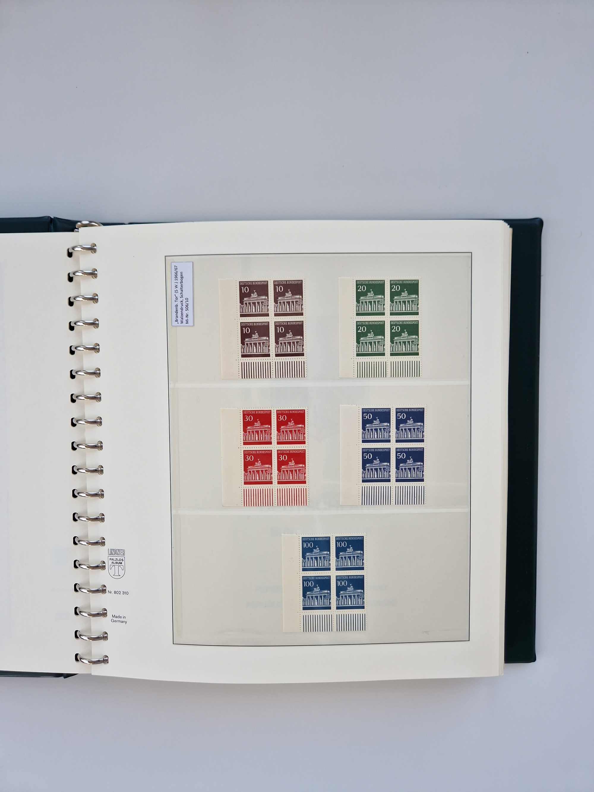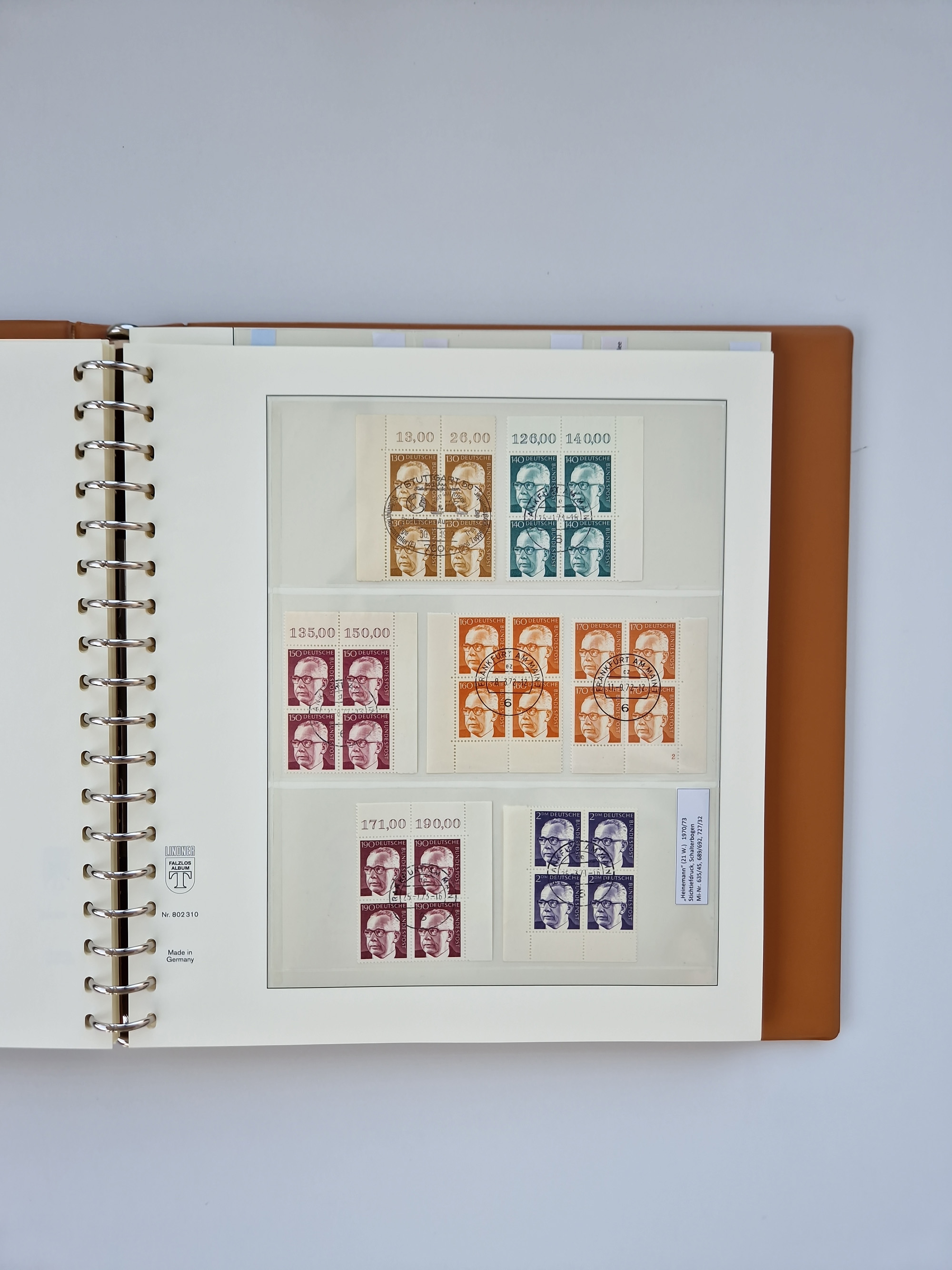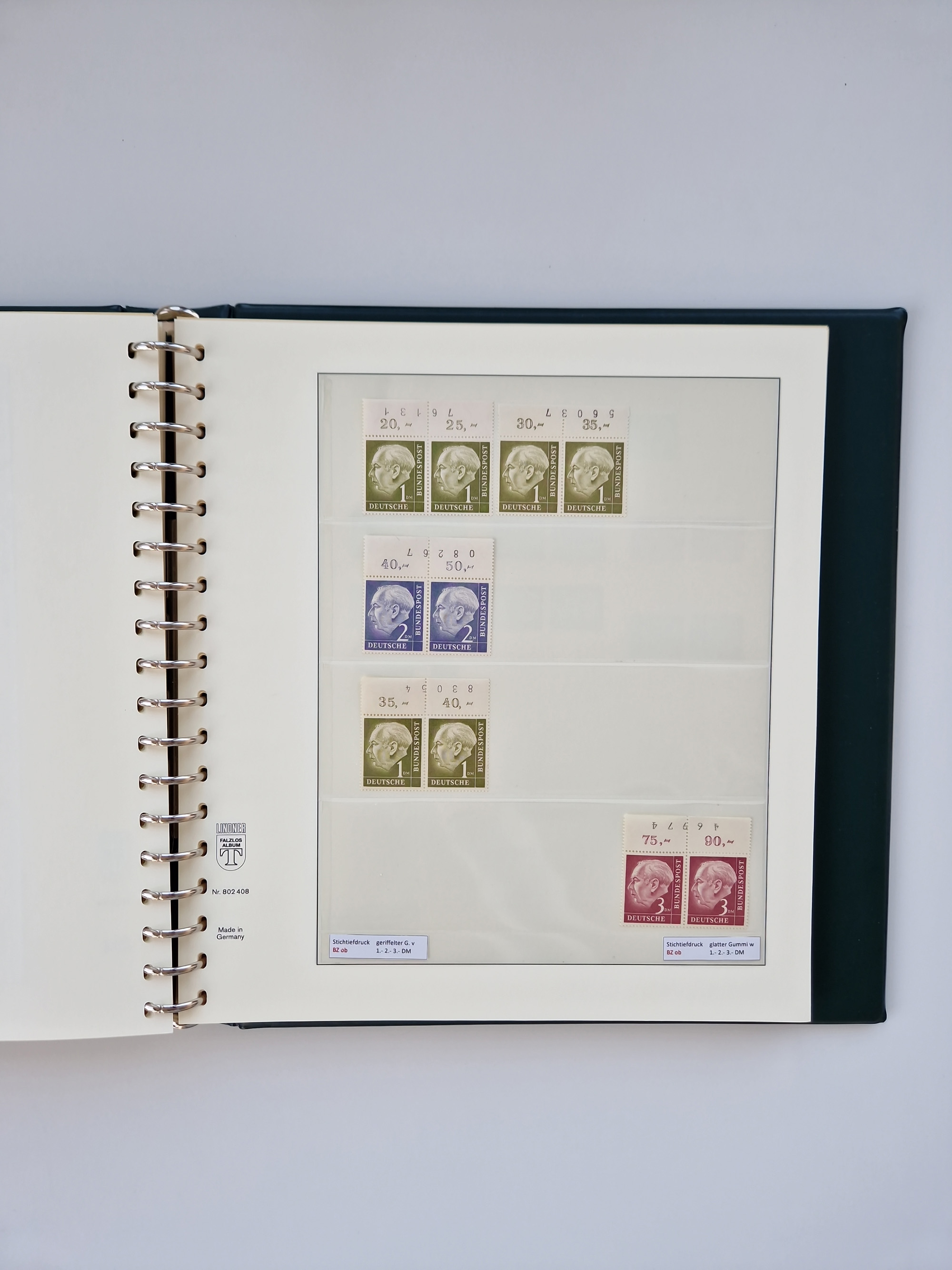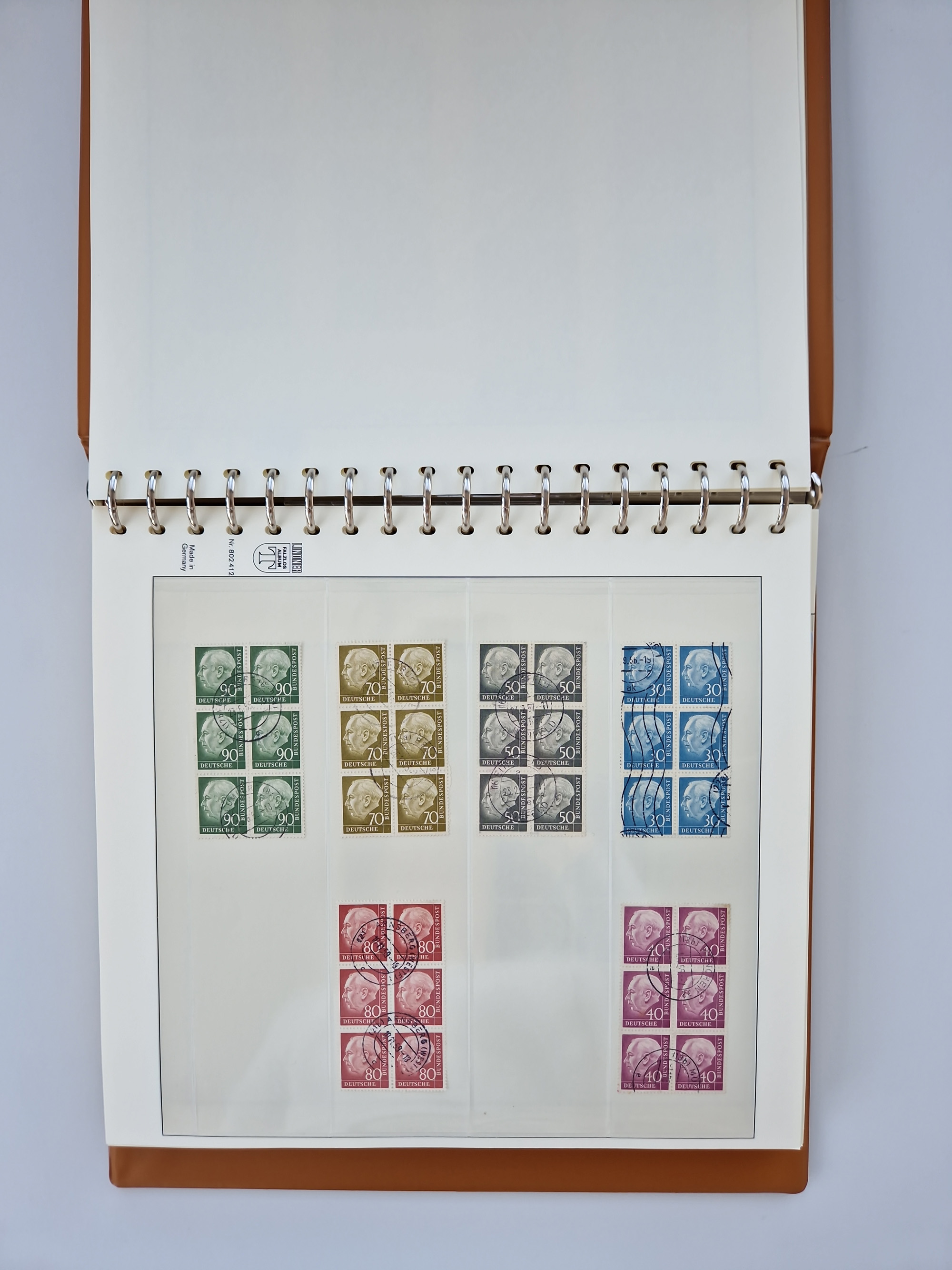 1951/94, postfrische Sammlung Dauerserien, dabei Posthorn in waagerechten oder senkrechten Paaren mit 3 Attesten und 6 Befunden A. Schlegel BPP, Heuss I Eckrandviererblocks, teils mit Druckerzeichen (Attest H.-D. Schlegel BPP). Heuss lumogen mit DZ Befund H.-D. Schlegel BPP. Heuss II Befund H-D Schlegel BPP. Danach Heuss III bis bedeutende Frauen 1994 alles Eckrandviererblocks oben links mit vielen Druckerzeichen und sonstigen Randbesonderheiten, im Lindner-Falzlosalbum.