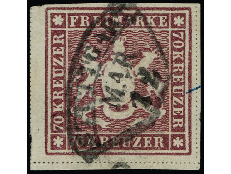 1873, 70 Kr. braunlila, farbfrisch, mit guter Wappenprägung, allseits breitrandig geschnitten, mit dreiseitigseitig vollen Trennungslinien, sauber mit schwarzem Fächerstempel “STUTTGART MAR 12” entwertet, rechts kleiner Federstrich, tadellos, sign. Drahn sowie Pfenninger mit Fotoattest (1965)