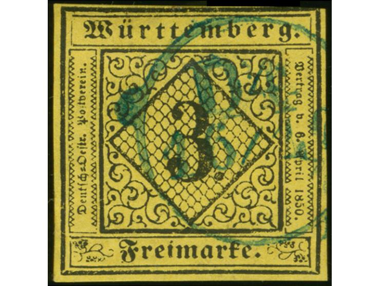 Ludwigsburg, Distributionsstempel “D4 16…" sauber und fast vollständig auf 1851 3 Kr. hellgelb, farbfrisch, oben gering touchiert, sonst tadellos, Befund Heinrich BPP (2025)