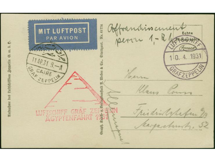 1931, Landungsfahrt nach Ägypten, Fotokarte mit Barfrankatur 1 RM und Bordpoststempel vom 10.4., verschickt vom Navigator Klaus Pruss an sich selbst in Friedrichshafen (Mi.-Nr. 164d)