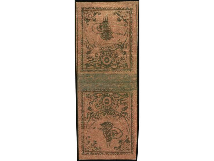 1863, 5 pi. black on thin deep red paper, very fresh colour, top margin unused tete-beche pair with large part original gum, blue control band, large margins all around, very fine (Isfila catalogue value 3.600€) (Isfila 6PV06)