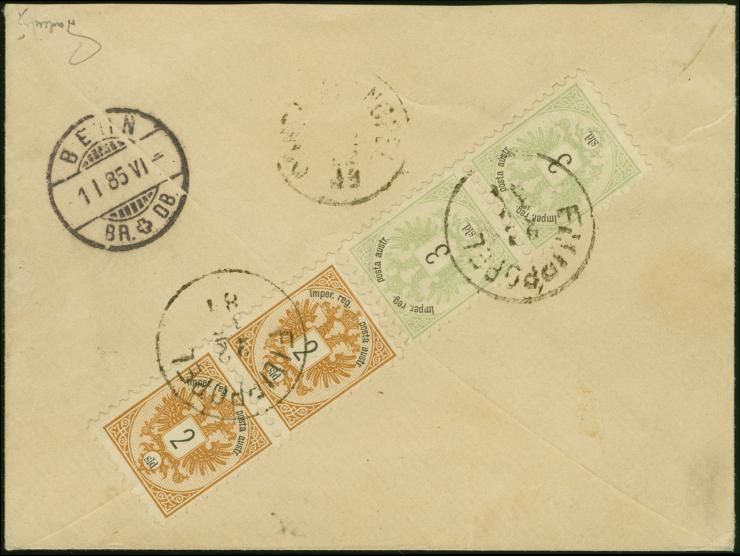 1885 (December 22), 2 sld. brown and 3sld. light green vertical pairs, perforated 9 ½, tied to reverse of cover to Bern, Switzerlandm by Filipoppel c.d.s., partial Constantinopel c.d.s. transit and Bern c.d.s. receiver (1 Jan, 1885) alongside, trivial shorter perf on 2 sld. pair, else a fresh and very fine cover. Cert. Ferchenbauer (2007).
