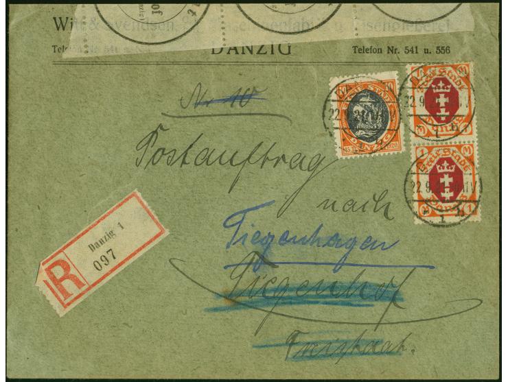 Kogge 10 Pfennig und senkrechtes Paar Staatswappen 1 Mark je mit Stempel “DANZIG *1h 22.9.21” als tarifgerechte Frankatur auf R-Postauftrag nach Tiegenhof mit Nachsendung nach Tiegenhagen mit Ankunftsstempel und oben Verschlussmarken vom Postamt Tiegenhof. Der Umschlag ist durch das Öffnen oben verkürzt, ansonsten in guter Erhaltung. R-Postaufträge aus der Inflationszeit sind nicht häufig