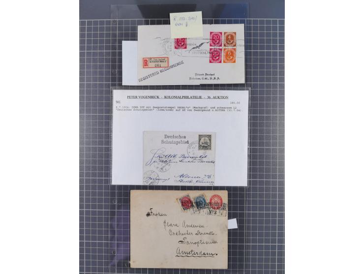 1868/1960 (ca.), ca. 170 Briefe, Karten Ansichtskarten und GSK zum Thema Schiffspost inkl. etwas Ausland, dabei Anlandestempel, viel Dt. Seepost und u.a. vier Belege 1895/1909 mit Stempel “KORSOR-KIEL…”, Ozean-Vordruckbrief 1928, frankierte Postkarte 1905 aus Panama mit L2 “PAQUEBOT CN.YX…..”, DSW Postkarte 1904 mit DSP OST-AFRIKA-LINIEN *o" und L2 “Deutsches Schutzgebiet” und R-Brief mit Posthorn-Zusammendrucken 1954 mit R-Zettel “Vom Ausland üb Frankfurt (Main) 2”. Dazu einige moderne Belege und Fotos, meist in guter Erhaltung, ex Steinmeyer