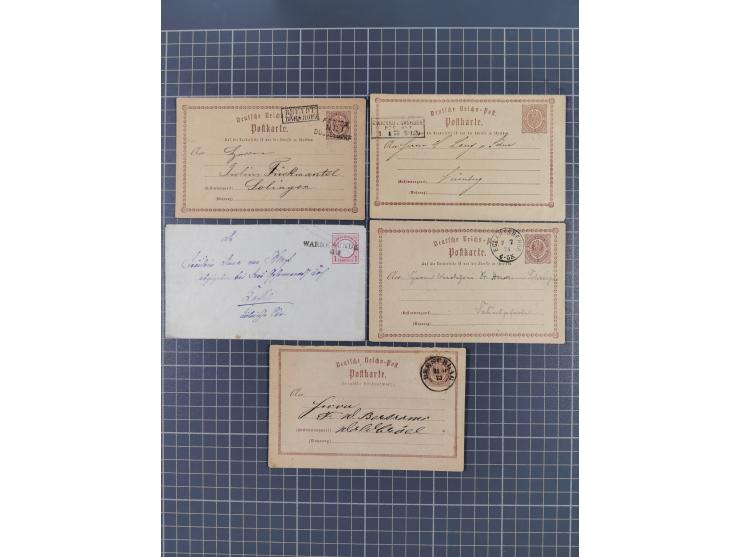 1872/74, sechs Ganzsachenkarten und Umschläge mit Besonderheiten bzw. interessanten Stempeln, dabei u.a. P1 mit Stempel “ZWICKAU” vom 1.1.1875, GSU 1 Gr. mit wertstufengleicher Zufrankatur nach Bern (FB Sommer BPP) und GSU 1 Gr. mit L2 “WARNEMÜNDE 11.2”, in guter Erhaltung