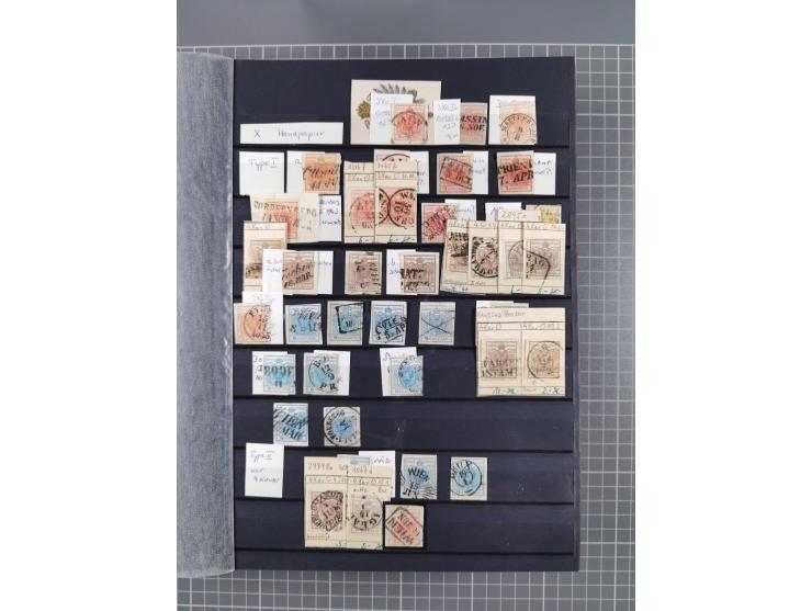 1850/1958 (ca.), reichhaltiger ungebrauchter und gestempelter Doubletten-Bestand, mit einigen Briefen, die erste Ausgabe mit vielen schönen Abstempelungen, dabei bessere Werte mit u.a. Mi.-Nr. 17b gestempelt (FB Rismondo BPP), Dollfuß 588 gestempelt, 555A mit Zufrankatur auf R-Brief mit Sonderstempel “WIPA 1933”, etc., Schwerpunkt vor 1930, in 5 Steckbüchern und 3 Boxes