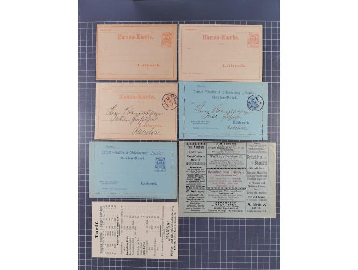 Lübeck-Hansa: 1897/1900, Partie mit sechs ungebrauchten und gebrauchten Ganzsachen (ohne Text). Dabei u.a. PU1 ungebraucht (Knitter- und Faltspuren)