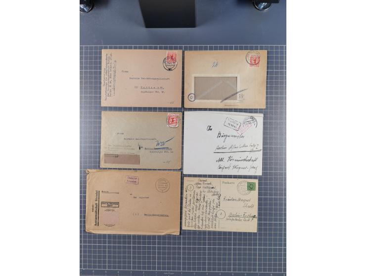 1945/48, über 200 Briefe, Karten und Ganzsachen mit frühe Post von und nach Berlin, R-Briefe, interessante Mischfrankaturen, Bezirkshandstempel-Frankaturen, Retourpost, Zensuren, viel Dienstpost der Alliierten usw.