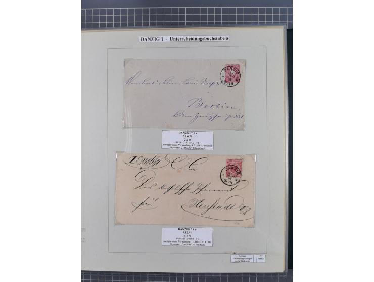 1880/1945, Postamt DANZIG: Interessante Sammlung mit über 200 Briefen, Karten und Einlieferungsscheinen etc., dabei auch etwas Bahnpost, Portomarken, Ganzsachen etc., alles sauber nach Unterscheidungsbuchstaben aufgezogen, meist gute Erhaltung